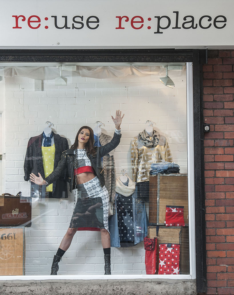 Former Miss Scotland in live window display at Salvation Army charity shop to showcase upcycled designer clothing